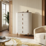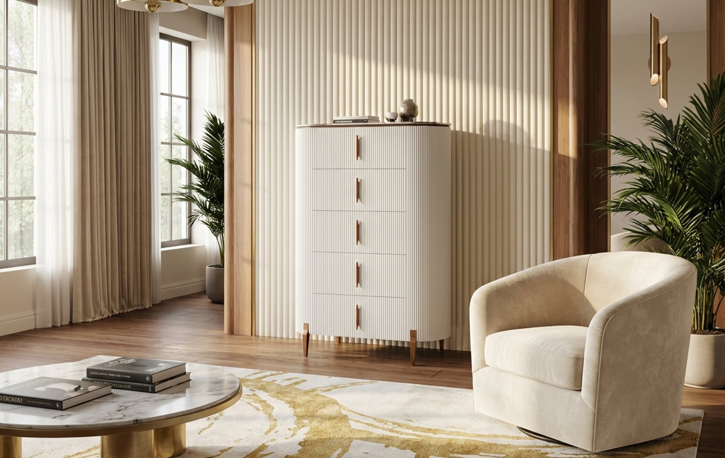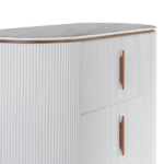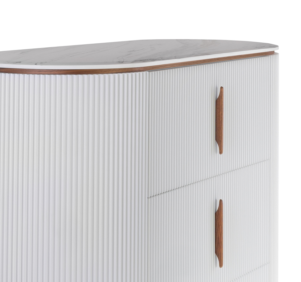 Komoda Valarme °61 o wyrafinowana interpretacja charakterystycznego stylu kolekcji Velarme, w której forma i detal tworzą spójną, elegancką całość. Bryła mebla została zbudowana z rytmicznie ułożonych lameli, które nadają jej lekkości i subtelnej dynamiki, jednocześnie miękko modelując kształt korpusu. Delikatnie zaokrąglone linie przełamują geometryczną strukturę frontów, wprowadzając do projektu harmonię i wizualną miękkość. Starannie dopracowane proporcje oraz szlachetne wykończenie sprawiają, że mebel staje się nie tylko funkcjonalnym elementem wyposażenia, ale również wyraźnym akcentem aranżacyjnym, podkreślającym charakter i elegancję wnętrza.