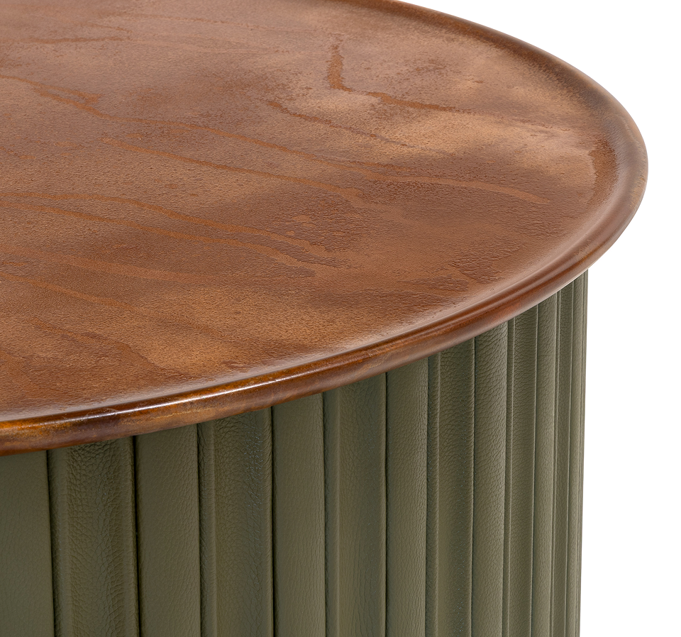 Stolik Artican zestawia rytm ręcznie tapicerowanych, skórzanych lameli z blatem, którego struktura powstaje w autorskim procesie nakładania kilkunastu warstw powłoki. Indywidualna, ręczna obróbka każdego z tych etapów nadaje powierzchni głębię i metaliczny charakter, niemożliwe do uzyskania w seryjnej produkcji.