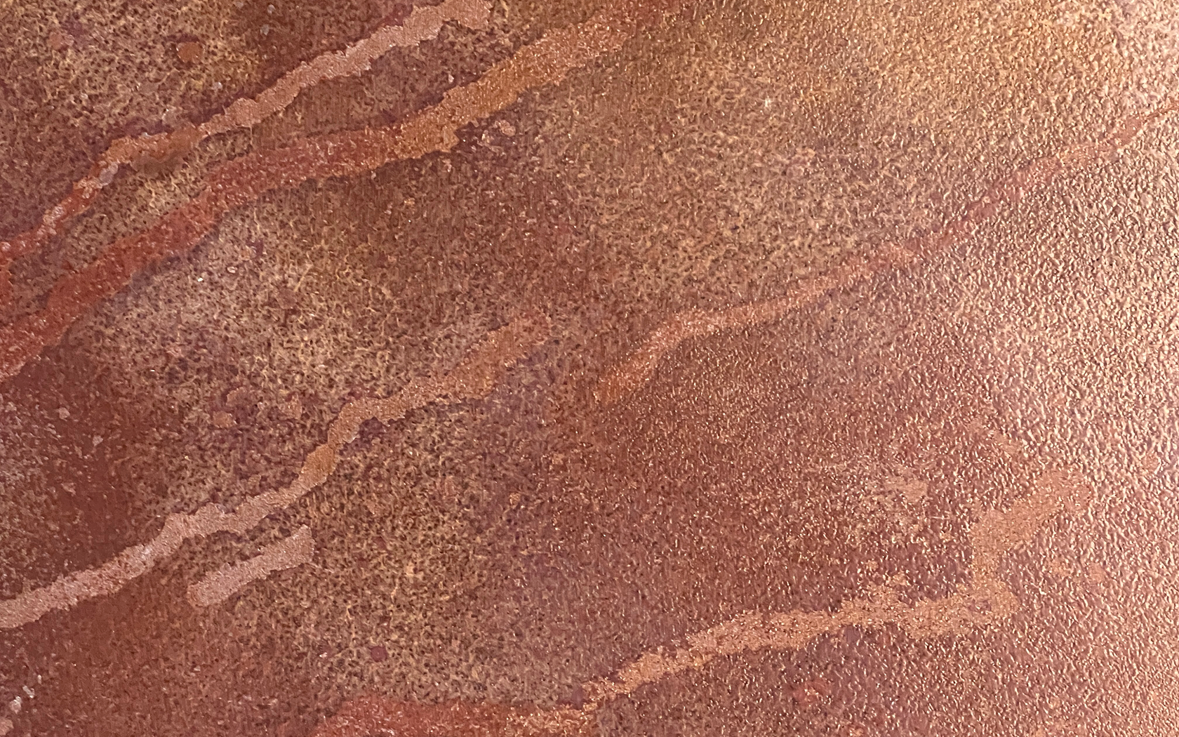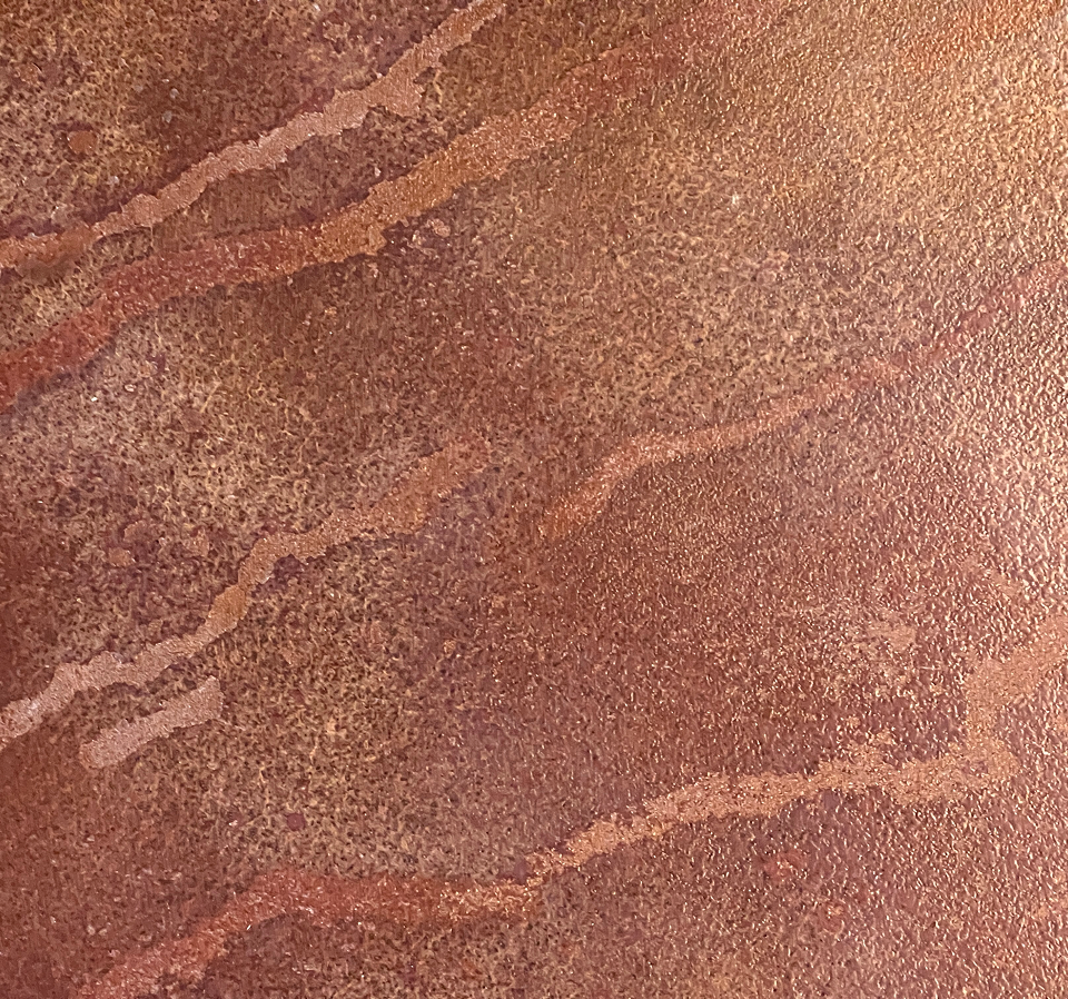 Głębia powierzchni blatu jest efektem nałożenia kilkunastu warstw powłok, w tym czterech podkładów oraz złotej bazy przełamanej oliwkową zielenią dla uzyskania miedzianego odcienia. Jego unikalną fakturę buduje specjalna farba zawierająca 90% stali kortenowskiej, która podczas malowania na płasko swobodnie ścieka do osi mebla, tworząc niepowtarzalne, organiczne wzory. Cały ten ręczny proces, obejmujący trawienie oraz precyzyjne przecieranie, zostaje ostatecznie „zamrożony” lakierem, co gwarantuje, że każdy egzemplarz jest niemożliwym do powtórzenia oryginałem