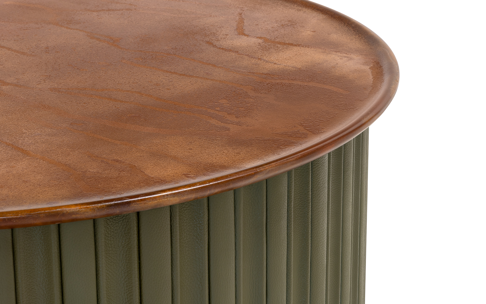 Każdy egzemplarz jest jedyny w swoim rodzaju dzięki ręcznemu zestawieniu tapicerowanych, skórzanych lameli z autorskim, wielowarstwowym blatem o głębokiej, metalicznej strukturze powstającej w procesie ręcznej obróbki