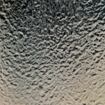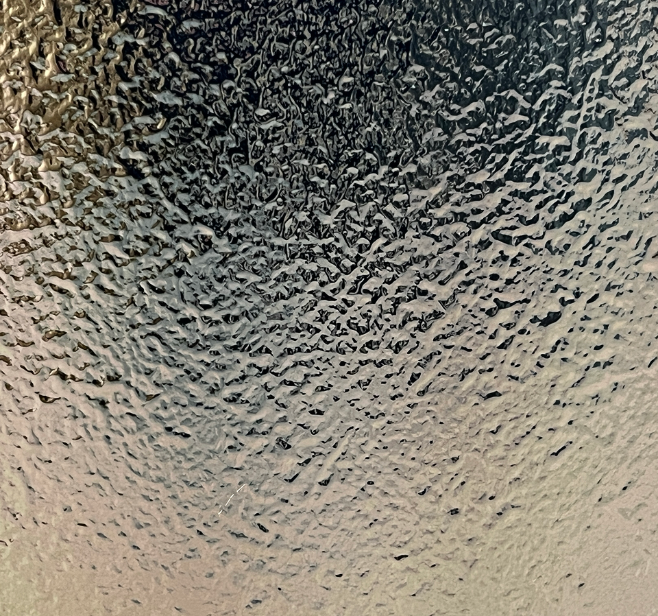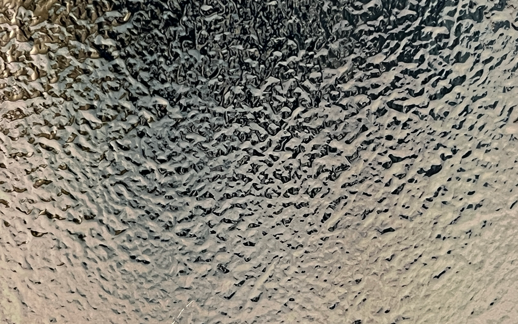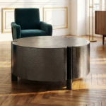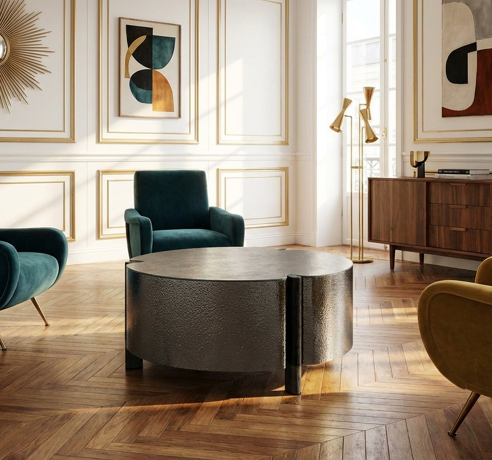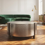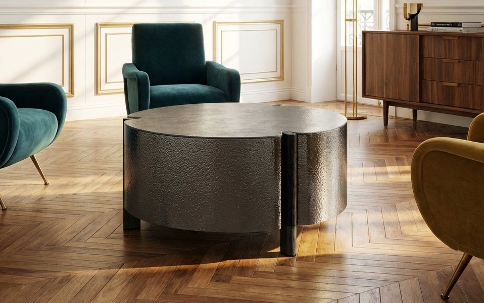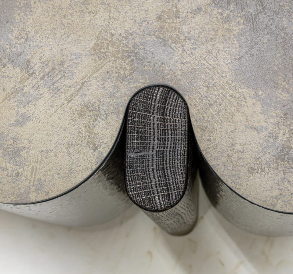 Nieregularna, młotkowana faktura stali odbiera materii jej fizyczny ciężar, zamieniając korpus mebla w rozedrganą, świetlną taflę. To wyrafinowana gra pozorów, w której solidny metal pod wpływem światła nabiera miękkości i organicznego, niemal płynnego charakteru.