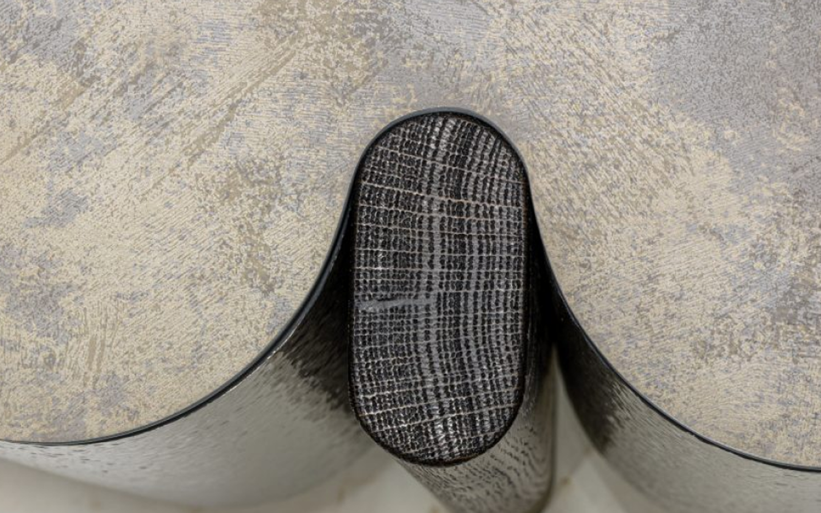 Korpus mebla pokryty jest warstwą tłoczonej blachy aluminiowej, dając efekt wibrującej, świetlnej tkanki. Blat wykonany z cienkiego laminatu ze sprasowanej żywicy dopełnia tę nieoczywistą, modernistyczną bryłę. Całość podkreślona jest przez księżycową strukturę wykończenia oraz unikalne połączenie nóg: szlachetny dąb o głębokim szczotkowaniu spotyka się tu z intrygującymi, skórzanymi akcentami u podstawy.