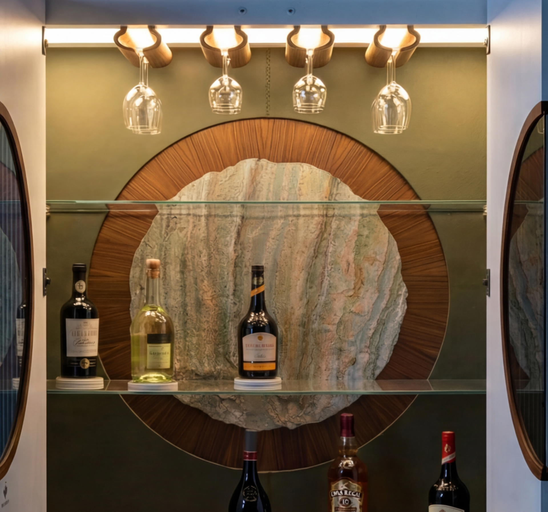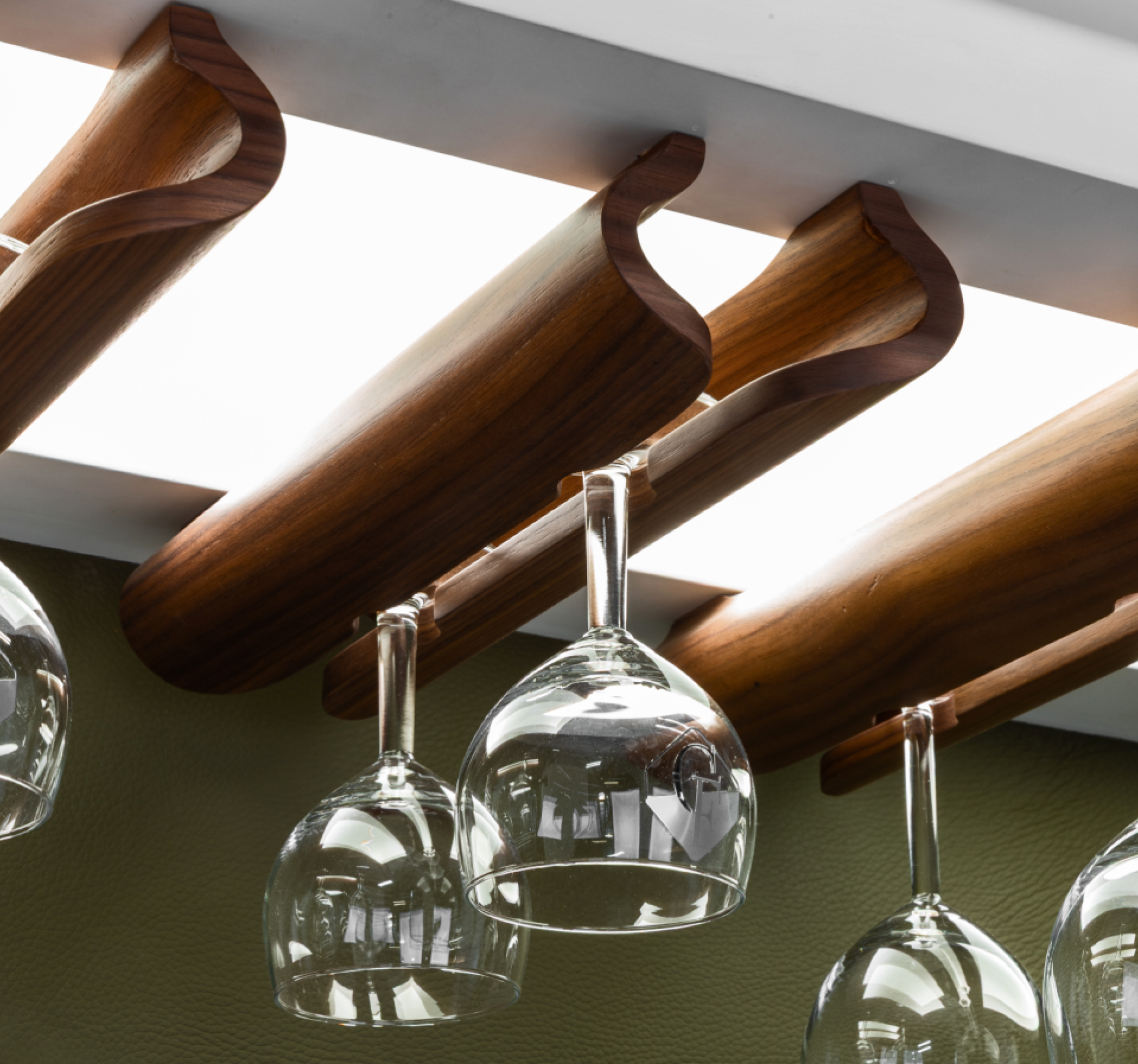 Toczone z orzecha amerykańskiego uchwyty na kieliszki porządkują przestrzeń a subtelne, orzechowe podstawki chronią szklane wnętrze, nadając odpowiednią powagę każdej kropli. Tu nie ma miejsca na przypadkowość. To zobowiązanie, by moment był bezkompromisowy.