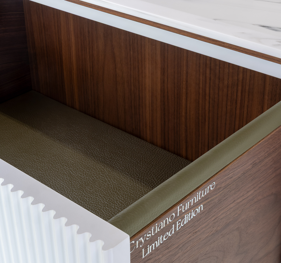 i luksusowego detalu w ramach flagowej kolekcji Crystiano Furniture. Bryły mebli zostały ukształtowana z zewnątrz z drobnych lameli, które płynnie przechodzą w delikatne, miękkie łuki. To świadoma rezygnacja z ostrych form na rzecz harmonijnego wzornictwa.